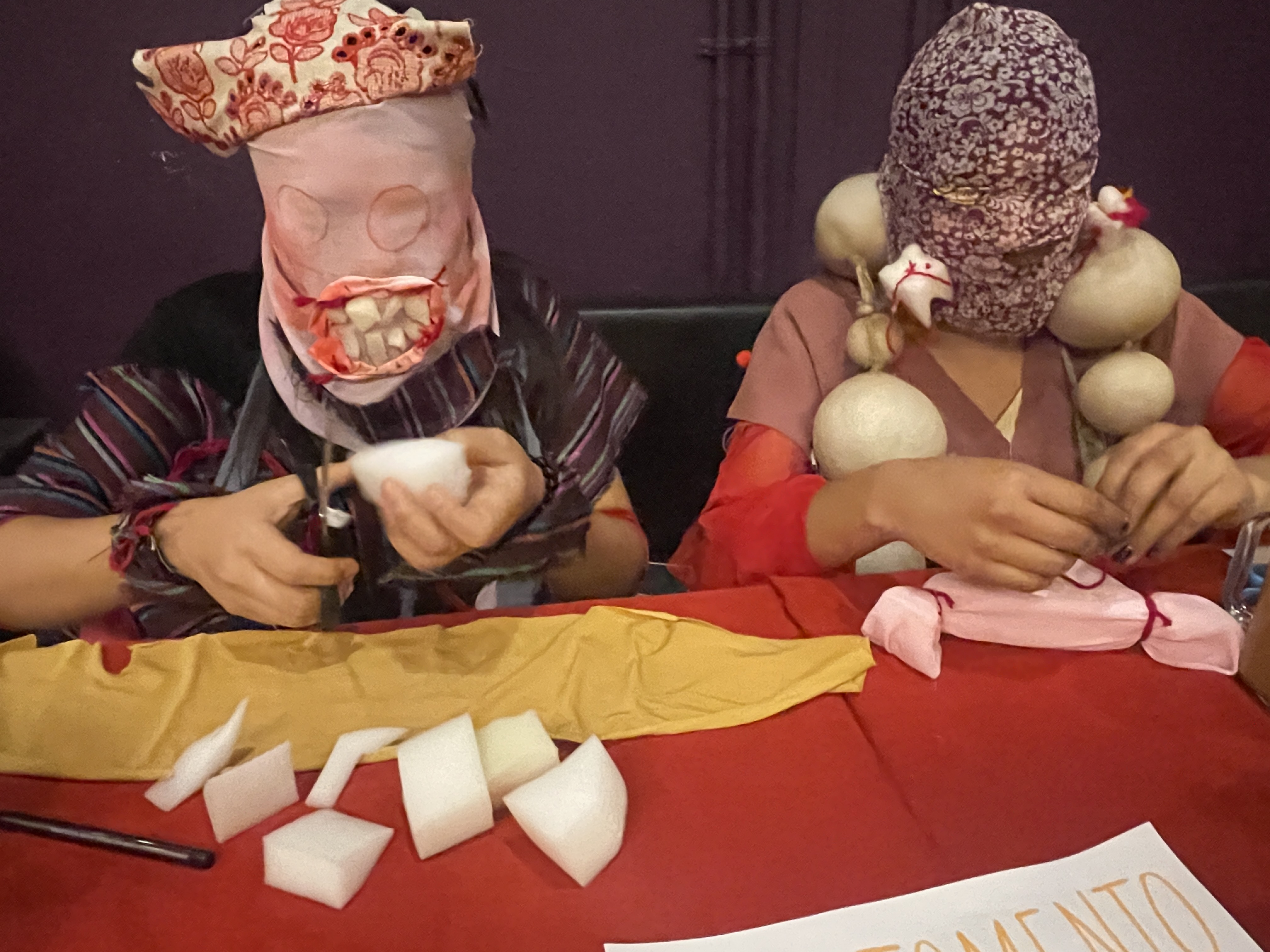 “Un taller sobre textiles, vestuario, cuerpo y performatividad. Tuvo lugar este fin de semana en El77 Espacio Cultural Autogestivo, aunque rápidamente se desbordó hacia las calles de la misma manera que nuestra pieles, fluidos y órganos salieron de su contenedor para volverse nuestra investidura. Una reflexión artística sobre el cuerpo y su constante transformación, la belleza, la fealdad y lo inefable de la enfermedad. Poros, cabello y tejido graso Doble cerebro para trabajar y emborrachar. Un corazón más grande. Un útero coquette envuelto en papel de regalo. Visceralidad expuesta” - Texto por Daniel Victoria.